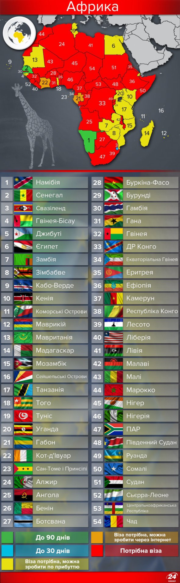 В Африці лише 3 країни мають безвіз з Україною: Намібія, Сенегал і Свазіленд. Ще в 17 країнах візу можна зробити після прибуття. Візу в Габон, Кот-д'Івуар, Сан-Томе і Принсіпі можна замовити через інтернет.