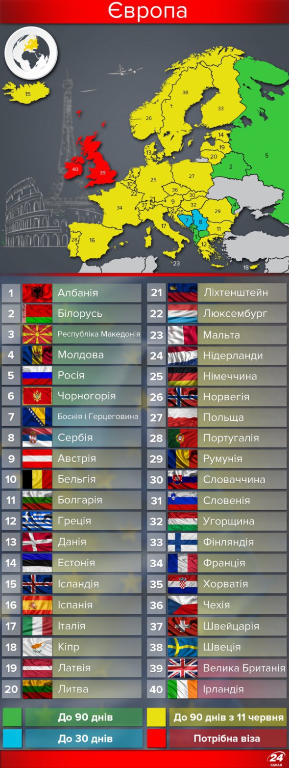 У Європі безвіз почне діяти з 38 країнами. Винятком є візовий режим з Великою Британією, Північною Ірландією та Ірландією.