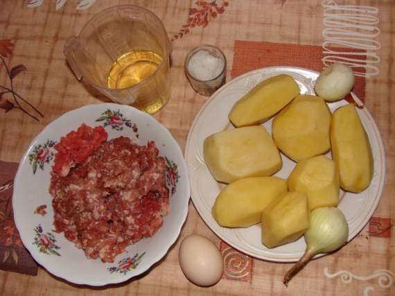 300 грам свинини пропускає через м'ясорубку. У м'ясний фарш додає натерту цибулю, сіль і перець за смаком. Ретельно перемішує. З готового фаршу робить коржі діаметром приблизно три сантиметри.