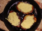 На розпечену сковороду столовою ложкою викладає картопляну масу. Коли вона підсмажиться, на неї кладе м'ясний корж.