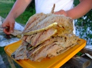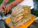 "Шашлик із пісної риби недобрий, тому беру скумбію, вона жирна. Рибину вибираю з широкою спинкою, там є що з"їсти. Як вузька, то тільки шкура і кістки. Купляю свіжоморожену. Чекаю поки розмерзнеться. Мию, відрізаю голови і роблю два маленькі поперечні надрізи зверху та внизу біля хвоста, потім розрізаю поздовж живота. Виймаю внутрєності хребет.