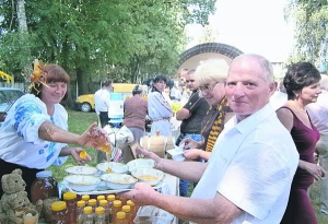 Голова товариства пасічників Яворівського району 64-річний Андрій Мруць набирає мед в учасниці Свята меду, що відбулося в неділю. До райцентру з'їхалися 35 власників пасік. Привезли гречаний, липовий, акацієвий мед, пилок, воскові свічки, прополіс. Перед початком ярмарку продукти освятили. Мед продавали по 70 грн/кг — на "двадцятку" дешевше, ніж у магазинах. За 0,5 л медовухи правили 30-50 грн.
