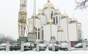 Збоку скляна будка з охоронцями. З неї видно машини. Вільні місця на території є завжди. У церкві кажуть: гроші, зібрані за паркування авто, підуть на будівництво. Біля храму стоїть висотний кран.
