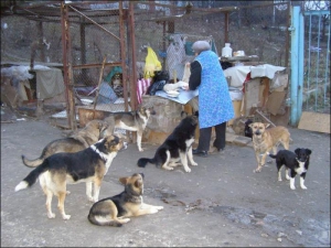 Безпритульних собак у Рівному захищають лише бабусі, які щодня годують десятки псів у місті. Близько 30 собак живуть біля автостоянки на вул. Ювілейній. Тут жінки, які за власним бажанням доглядають за бродячими тваринами, спорудили халабуду з дощок і металевої сітки.