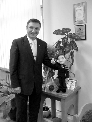 — Бачите, у нього навіть такий самий довгий ніс, — позує біля своєї копії. — Цього року виділили 335 тисяч на Театр актора і ляльки. Зокрема купили бус для перевезення трупи й декорацій. Ось таким чином актори мені віддячили.