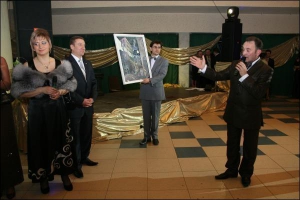 Потім провели святкову лотерею. У барабані прокрутили кульки з прізвищами запрошених. Шістьом із них Роман Заставний подарував золоті ланцюжки з кулонами — ангелами й Божою Матір"ю та твори Костюкова і Мамчура.