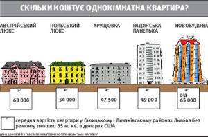$95 тис. коштує найдорожча однокімнатна квартира, виставлена на продаж у Львові. В оголошенні сказано: "Австрійський будинок, другий поверх, 55 квадратних метрів. Дизайнерський євроремонт, кухня-студіо, сауна, меблі". Це житло пропонують кілька агентств нерухомості.
