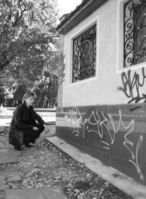 — Коли хата нештукатурена була, її не рухали. По цеглі нецікаво було писати. А як тільки ми її помалювали — зразу маєш тобі, — Наталя показує бічну стіну, що впритул до тротуару. По ній чорною фарбою виведені ієрогліфи. Плитка заляпана білими написами. — Пробували змивати фарбу — не виходить. Знайомі порадили купити автомобільний розчинник, яким смолу відчищають. Може, плитку відмиємо. А стіну треба перемальовувати. Сусід розповідав, що тієї ночі, вже під ранок, бачив двох молодих чоловіків, років по 20. Одягнені були як неформали. Ми написали заяву в міліцію.