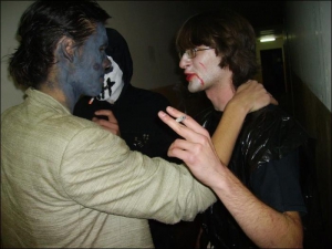 — Раніше якось веселіше було. — Микола згадує свої попередні костюми. — Якось придумав собі образ "зайчика-убивці". Знайшов заячі вуха, сірий светр, морду мені дівчата розмалювали. Начепив чорні окуляри. Десь лома роздобув — я ж убивця! Усі переживали, як би мені тим ломом ніхто по голові не дав. А ще колись був "гомиком" — у дівчат украв бюстгальтер нульового розміру, поверх гольфа носив.