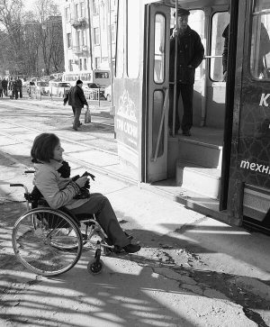 Під'їжджає трамвай. Сходинки на півметра вищі рівня землі. Без сторонньої допомоги потрапити всередину на візку неможливо.