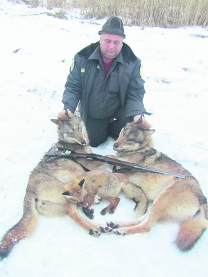 Мисливець 43-річний Михайло Адам позує з двома вовками і лисицею біля Нового Роздолу. Самця завважки 43 кг убив одним пострілом у голову. На 7 кг легшу самицю застрелив його товариш.