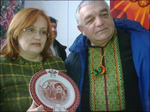 Майстер Михайло Мандзюк із селища Отинія Коломийського району Івано-Франківщини на невеликому стелажі розмістив свою виставку фарфорових тарелів різного розміру із зображенням Володимира Івасюка.