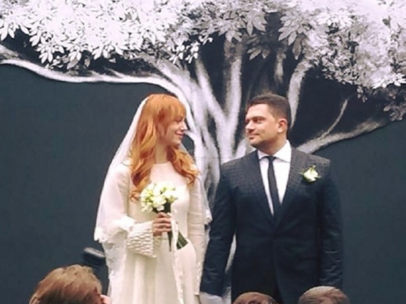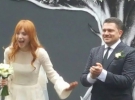 Для весілля Тарабарова обрала закриту сукню кольору айворі, поділ сукні якої був прикрашений камінням.