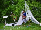 Вечірку організували на природі. Місцевість була декорована всілякими яскравими деталями. Помітним було також і вбрання молодят.