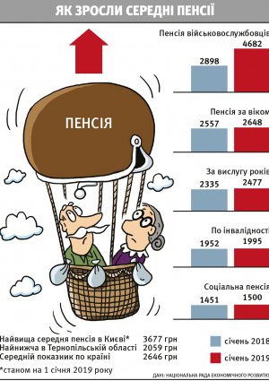 Із 1 січня мінімальна пенсія становить 1669 грн. Зросла від початку року на 172 грн. В Україні діє солідарна пенсійна система. Виплати залежать від страхового стажу та розміру зарплати. На пенсію мають право громадяни старші за 65 років зі страховим стажем не менш як 30 років для жінок і 35 для чоловіків.