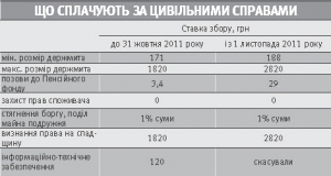 Приміром, за позовами пенсіонерів до Пенсійного фонду доведеться платити 29 грн. Раніше було 3,4 грн. За визнання права спадщини — на 1 тис. грн більше, 2,8 тис. грн. Це найбільша сума, яку можуть стягувати за розгляд справи. Так передбачено законом "Про судовий збір" №3674-VІ. За нього проголосували 8 липня цьогоріч.