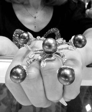 Продавець дістає великий перстень-"метелик" із п'ятьма чорними перлинами та діамантами. Каже, їх привозять із Таїті.