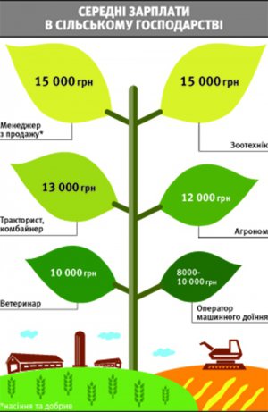 — Багато вакансій надходить від великих агрокомпаній, — розповідає експерт ринку праці 47-річна Тетяна Пашкіна. — Доярці, садівнику, підсобному робітнику пропонують від 10 тисяч гривень. На пару тисяч більше платять інженеру-механіку, технологу комбікормів. Менеджери та консультанти з продажу отримують 20 тисяч гривень. Про середні зарплати в агросекторі важко казати. Із 1,4 тисячі вакансій лише в 570 вказують суму. У більшості компаній зарплата є комерційною таємницею. Про суму домовляються під час співбесіди. Найбільше пропонують зернотрейдерам (займаються гуртовими продажами зерна за кордон. — ГПУ) і керівникам агропідприємств — 100–130 тисяч гривень.