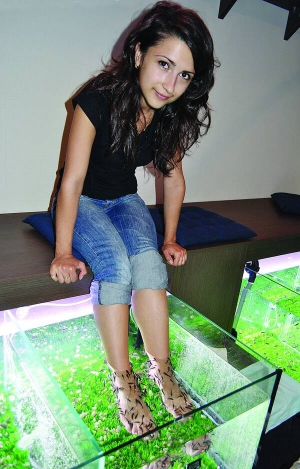 Жителька столичного житломасиву Академмістечко Анна Ращенко, 23 роки, робить пілінг для ніг в акваріумі з рибками гарра руфа. Цю послугу пропонують у торговельно-розважальному центрі "Дрім таун" на просп. Оболонському. Біля ковзанки встановили чотири акваріуми. У кожному 200 рибок завдовжки 5-10 см. Роти-присоски обрамлені шкребками. Ними риба зчісує зі шкіри ніг змертвілу шкіру. Гарра руфа застосовують також для лікування варикозу та псоріазу.
