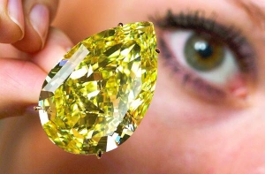 Рідкісний діамант яскраво-жовтого забарвлення вагою 110 каратів, або 22 грами, аукціон "Сотбіз" продасть сьогодні у Женеві. Коштовний камінь видобули у Південній Африці. Вправлений у золоту каблучку. Експерти оцінюють прикрасу в $15 млн. Однак ціна продажу може виявитися у кілька разів вища. Цьогоріч "Сотбіз" продав рожевий діамант на 25 каратів за $46 млн, удесятеро дорожче очікуваного.