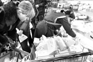 У столичному супермаркеті "Фора" на вул. Татарській семеро покупців стоять біля холодильників із сиром. Російський торгової марки "Шостка" подешевшав на 25 грн — до 65,05.