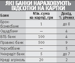 На залишок коштів на зарплатних та інших платіжних картках системи "Віза електрон" цей банк нараховує до 8% річних. Отримувати дохід за картками пропонують ще десяток банків. Картки зазвичай випускають безплатно. Плати за річне обслуговування теж не беруть. Наприклад, Ощадбанк на залишок на платіжній картці нараховує 4% річних. Однак таку послугу пропонують тільки пенсіонерам і військовослужбовцям. На платіжні картки "Правексбанку" нараховують 9% річних. Але на картці має бути щонайменше 500 грн. На них також можна відкрити позику, овердрафт. За користування кредитом нарахують 34% річних. "Приватбанк" теж нараховує дохід 10% річних. Можливість передбачена тільки для кредитних карток. Вони повинні бути без заборгованості, хоча б зі 100 грн на рахунку.