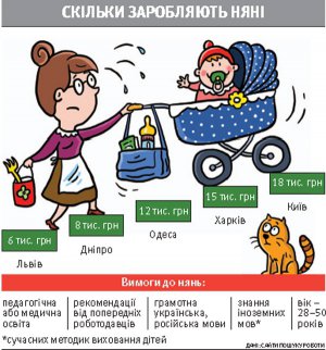 Найвигідніше працювати в сім'ях. У Києві можна заробити 18–23 тисячі гривень на місяць. Також послуги оплачують погодинно — 80–100 гривень. Традиційно найбільше заробляють няні для новонароджених. Працюють у вахтовий спосіб — доба на роботі, кілька вихідних. До них особливі вимоги — обов'язкова медична освіта, навички масажу для немовлят, медична книжка, досвід роботи, рекомендації. Зазвичай харчування та житло надають безкоштовно.