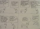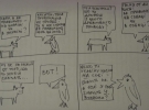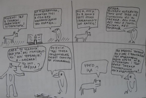 - Вона не місцями. Вона постійно. Це у неї просто такий внутрішній світ. Це нудно - коли Сава похожа на сову. Це тавтологія. Це як коли тобі кажуть "Ти Саша? Ні, я б тебе ніколи в жизні не назвав Сашою. Ти більше похожий на Женю". А насправді комікси з'явилися саме про цих героїв, мабуть, бо я навчився швидко малювати собак. І ворон. Але мені хотілося, шоб це була сова. Бо вона спершу таки була совою, але сов малювати на якусь дещицю часу повільніше, ніж ворон. І ще - чомусь у всіх коміксах Сава стоїть справа, а Сабака зліва. Може, це несе в собі якийсь філософський підтекст. Але скоріш за все ні.