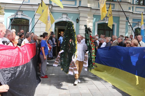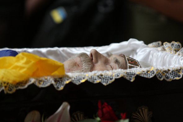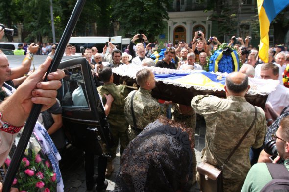 "Коли ми виносили Левка Лук'яненка в Хотові (село під Києвом, де 9 липня прощалися з Лук'яненком, - Gazeta.ua), відчував, що виношу його із Пісків, Іловайська, Донецького аеропорту. Фізично відчував, що це мій гетьман, отаман, і я його виношу з бою, тому що все його життя - це був бій", - каже у прощальному слові заступник комбата добровольчого батальйону ОУН Андрій Cивий (Пастушенко).