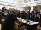 Кілька сотень людей прощаються з героєм України протягом більш, ніж двох годин. По завершенню труну заносять у катафалк, щоб перевезти до столичного Володимирського собору. Тарас Компаніченко виконує "Заповіт", присутні приєднуються. По обидва боки коридору для труни люди тримають синьо-жовтий і червоно-чорний прапори.
