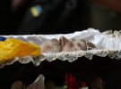 Шестеро чоловіків у військовому виносять труну і ставлять у катафалк. Присутні співають державний гімн, а потім тричі вигукують "Слава Україні!" і "Героям Слава!". Дорогу перед авто встеляють пелюстками троянд. Труну везуть на Байкове кладовище.