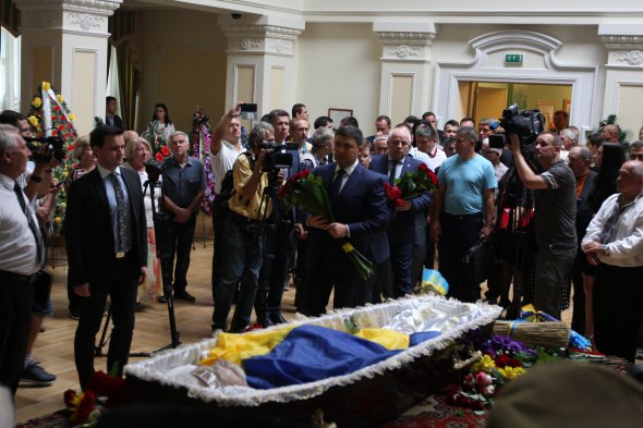 Провести політика в останню путь прийшли прем'єр-міністр Володимир Гройсман, голова Верховної Ради Андрій Парубій, міністри Уляна Супрун, Євген Нищук, Лілія Гриневич, Степан Кубів. Кладуть букети червоних троянд і по черзі підходять висловити співчуття рідним – дружині Надії Іванівні та внучці Ганні. Останнє слово беруть побратими Левка Григоровича.