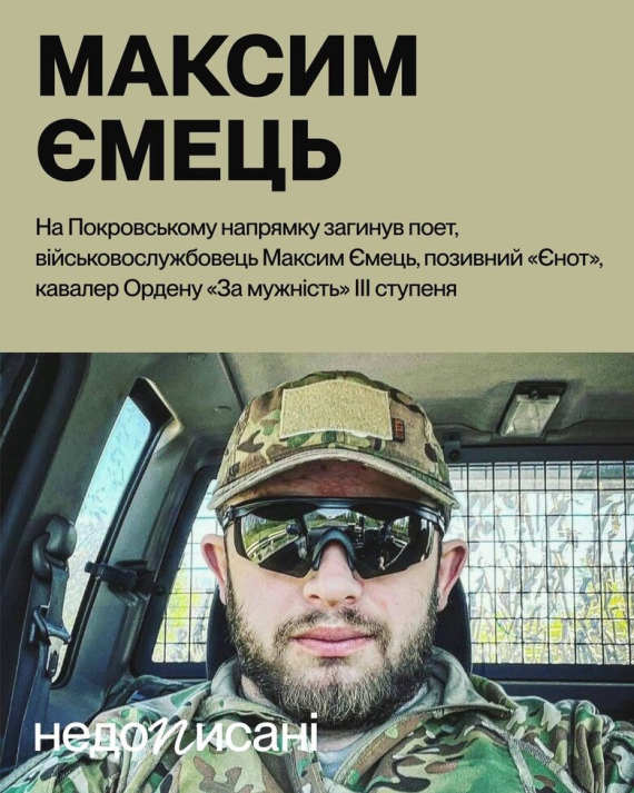На Покровському напрямку загинув 30-річний поет та військовий Максим Ємець з позивним "Єнот".