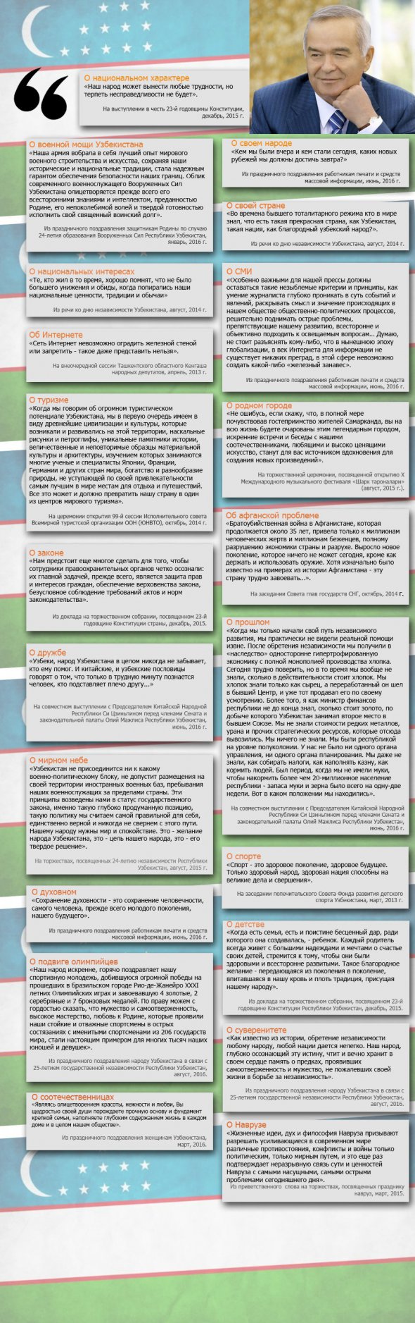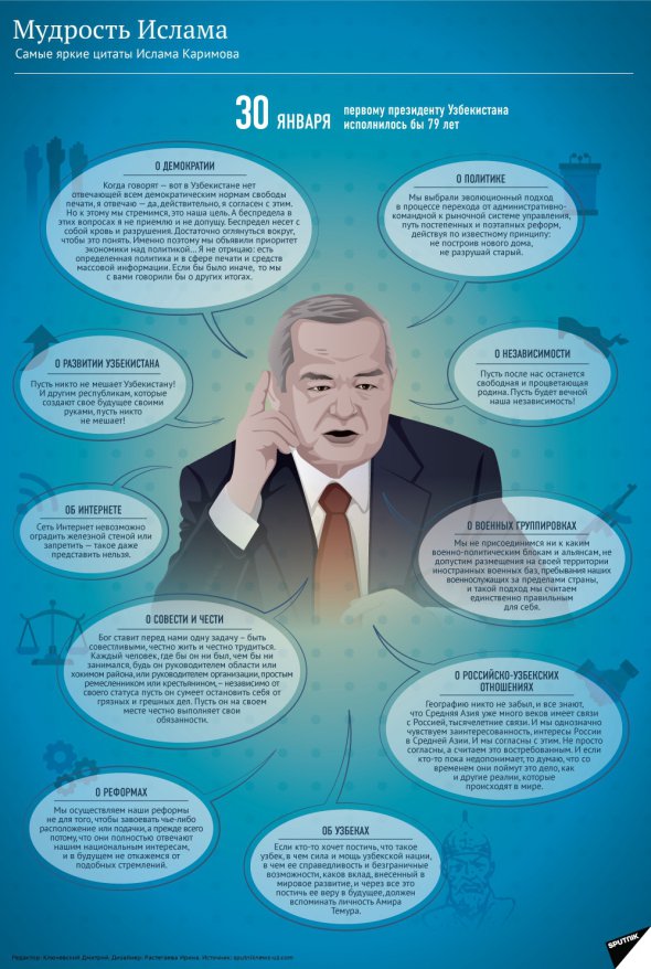 "Я прошу, передайте Росії, нас не треба захищати. Щоб хтось до нас прийшов і гинув на рубежах Узбекистану? Не треба за нас проливати кров. Узбеки здатні самі відповісти ударом на удар", - так звучала одна з найяскравіших думок беззмінного лідера Узбекистану з 1989 року Іслама Карімова. Він помер 2 вересня 2016 роки після інсульту в Ташкенті.