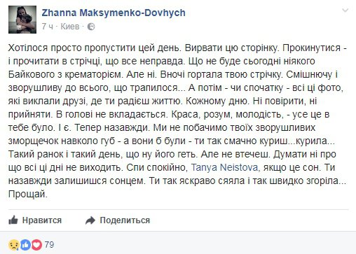 "Таня, ти зробила неможливе, в одному місці зібрала таку кількість чудових людей. Сумно від того що привід такой. Усі вірять що ти і там де ти є зараз, влаштуєш шикарну вечірку на честь своїх друзів, які внизу роблять вечірку на честь тебе. RIP друже", - поділився в Facebook її друг Сергій Рістенко.