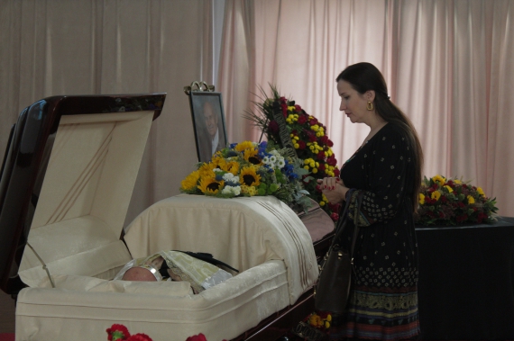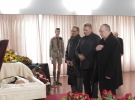 У залі грає жалобна музика. Біля труни стоять кошики з квітами і калиною. За нею — перев'язаний чорною стрічкою портрет Гаврилишина.