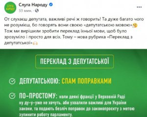 "Ось слухаєш депутата, важливі речі ж говорить! І багато чого не розумієш, бо кажуть вони своєю "депутатською мовою". Тому ми вирішили зробити переклад їхньої мови, щоб було зрозуміло і просто для всіх. Тому — нова рубрика "Переклад з депутатської", - повідомила партія у Facebook.