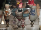 "Коли в 1953 році в СРСР російською вийшов переклад книги Джанні Родарі "Пригоди Чіполліно", ленінградська фабрика випустила невеликим тиражем серію персонажів казки. Тут ми бачимо і сеньйора Помідора, і барона Апельсина, й інших. Потім серії доповнювалися. Ще одна колекція - серія, що вийшла до 150-річчя Пушкіна, - його казкові персонажі. У нас на виставці є іграшки до казок про Золоту Рибку і Царя Салтана. І остання - це космічна серія, яка стала популярною після польоту Гагаріна. Там представлені ракети, супутники, скафандри..."