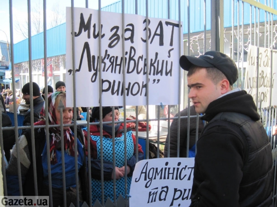 ТОВ "Квіткова галявина" викупили ринок за 6 мільйонів гривень. Продавці, які вже звикли до таких візитів, їх не впустили, закрили вхідні ворота та розвісили на них нашвидкоруч написані плакати із написами: "Не віддамо ТОВ Лук'янівський ринок". Старе керівництво вважає, що ринок передали незаконно. Запевняють, що за цим всім стоїть колишній голова райдержадміністрації Шевченківського району Віктор Пилипишин.