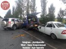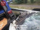 Мікроавтобус врізався у відбійник і його затисло збоку джипом, а ззаду його наздогнала "Лада". Мікроавтобус і джип сильно пошкоджені.