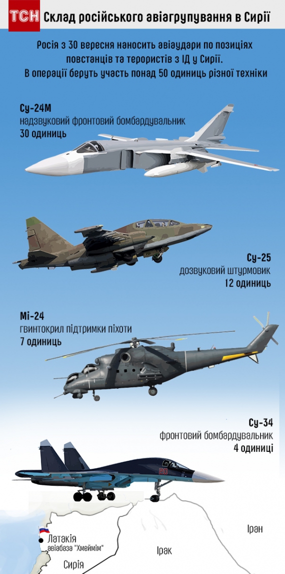 На російській авіабазі "Хмеймім" неподалік від Латакії нараховується 30 фронтових бомбардувальників Су-24М, 12 штурмовиків Су-25, 7 вертольотів Мі-24 і чотири фронтові бомбардувальники Су-34.