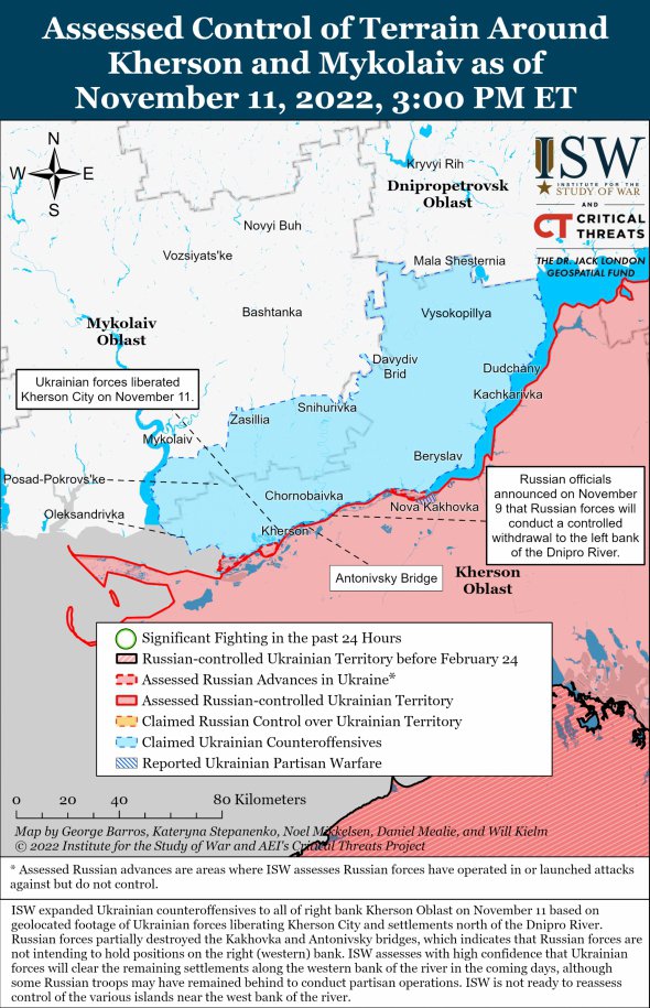 Росіяни тим часом втекли на лівобережжя. Водночас деякі російські солдати все ще залишаються на правому березі, підтвердили у американському Інституті вивчення війни ISW.