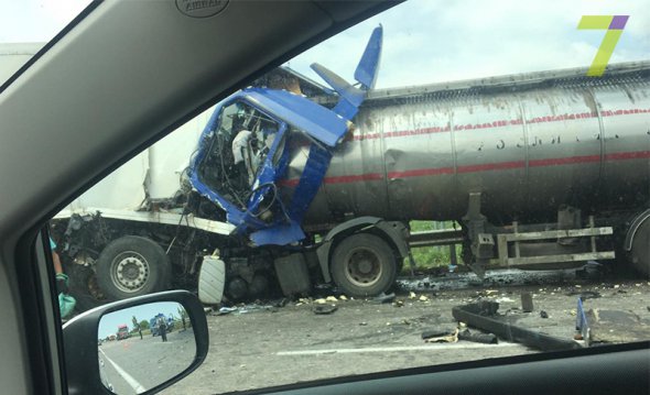 На 65-му кілометрі автотраси Київ - Одеса сталася ДТП за участю вантажівки Renault Magnum 480 і позашляховика BMW X3. У результаті зіткнення вантажівка перекинулася і заблокувала рух відразу двох смуг. Водій отримав травми.