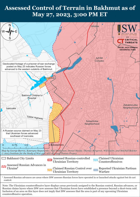 Росія перекидає в Бахмут підрозділи так званої ДНР. Це може знизити темпи наступальних дій РФ в районі Авдіївки, де раніше концентрувались ці сили. Останніми днями темпи російських атак біля Авдіївки зменшилися. 27 травня український Генштаб повідомив, що російські війська провели 13 бойових операцій на сході України, у тому числі сім обстрілів у районі Мар'їнки.