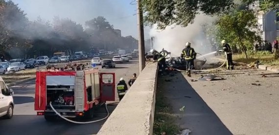 Вибух автомобіля Nissan Primera в Дніпрі стався на тимчасовій зупинці навпроти міської лікарні. Загинули двоє людей. Їхні тіла буквально розірвало на частини й розкидало навкруги.