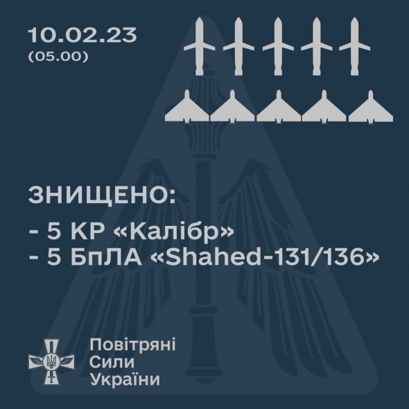 "Силами та засобами Повітряних Сил ЗС України знищено п'ять крилатих ракет "Калібр" та стільки ж ударних дронів "Shahed-136/131". Також окупанти завдали масованого удару зенітними ракетами С-300 з районів російського Бєлгорода і тимчасово захопленого Токмака Запорізької області", ‒ йдеться у повідомленні.