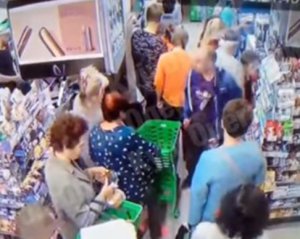 На відео можна побачити, що біля каси стоїть гурт людей, серед них чоловік в синій кофті і хлопчик. Раптом чоловік підійшов до дитини, вхопив за голову і різко повернув.
