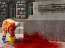 Чоловік облив червоною фарбою сходи біля будівлі КМДА на Хрещатику.