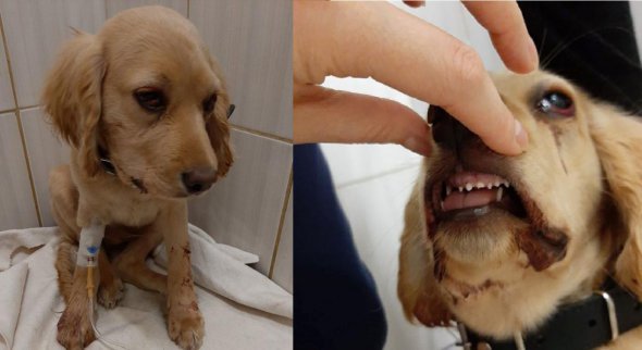 Врятували пса небайдужі громадяни, вони ж викликали на місце події поліцію. У тваринки попередньо діагностували крововилив в очі, пошкодження щелепи, зубів і черепно-мозкову травму.