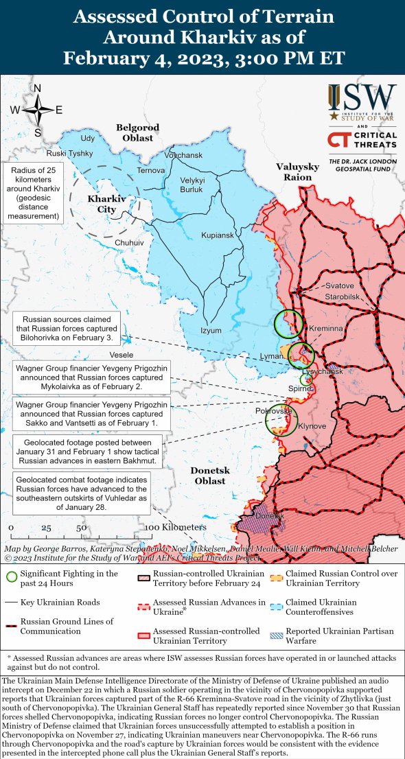 Російські війська 4 лютого продовжили наступ у районі Бахмута. За даними українського Генштабу, ЗСУ відбили російські штурми біля самого Бахмута, в межах 31 км на північний схід від міста поблизу Верхокам'янського, Красної Гори та Парасковіївки.